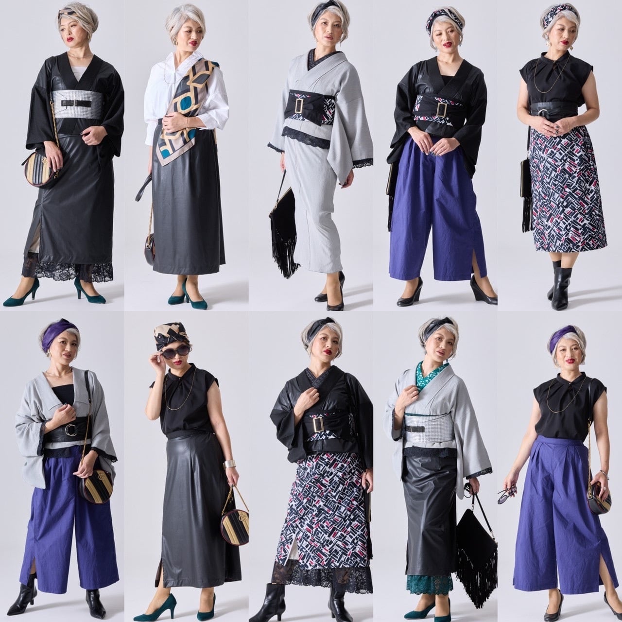 下衣を紫のワイドパンツに変えて、黒サッシュベルトを締めてもステキです。