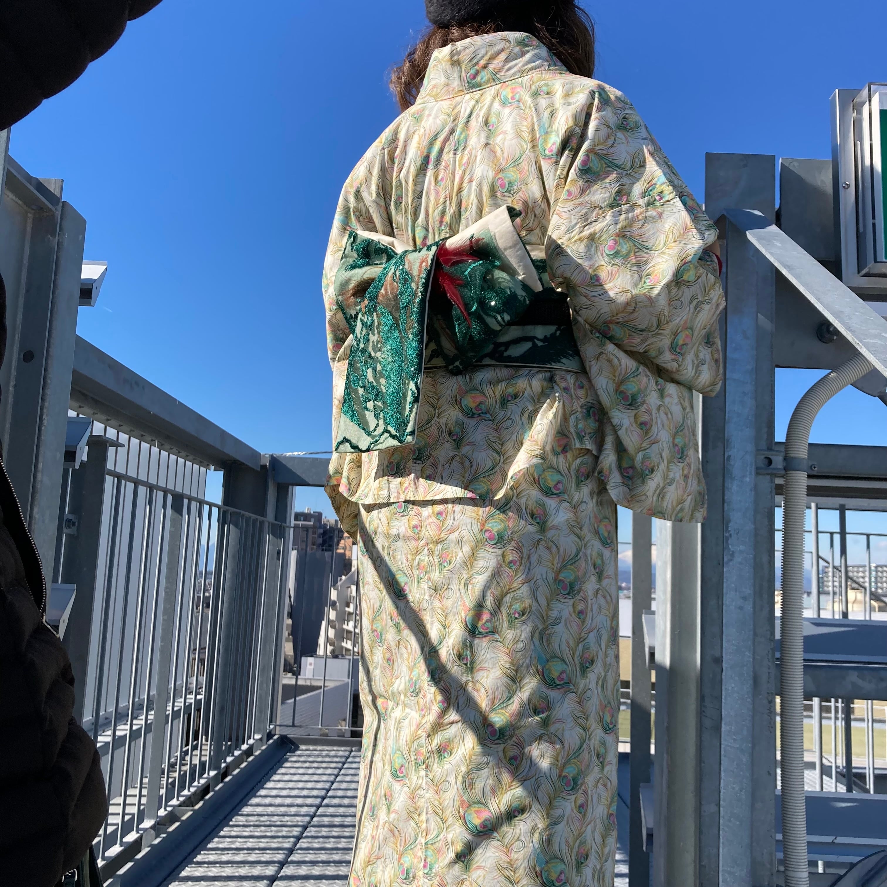 帯は「クジャク羽根をモチーフ」に帯結びをコーデイネート。
